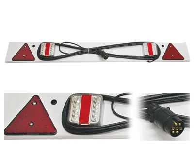 Kompletny zestaw oświetlenia tylnego AUTOLINE do przyczep i naczep, gotowy do natychmiastowego montażu. W skład zestawu wchodzi panel z lampami LED o długości 120 cm, trójkątne odblaski zwiększające widoczność oraz kompletna instalacja elektryczna. Zestaw wyposażony w 10-metrowy przewód zasilający zakończony standardową 7-pinową wtyczką, co gwarantuje pełną kompatybilność z większością pojazdów ciągnących. Zasilanie 12V sprawia, że system idealnie współpracuje z instalacjami samochodowymi. Panel wykonany z wytrzymałego tworzywa sztucznego zapewnia odporność na warunki atmosferyczne i uszkodzenia mechaniczne. Lampy LED charakteryzują się długą żywotnością i niskim poborem prądu. Zestaw objęty 12-miesięczną gwarancją producenta. Idealne rozwiązanie dla właścicieli przyczep lekkich, rolniczych, budowlanych oraz firm transportowych poszukujących niezawodnego oświetlenia spełniającego wymogi ruchu drogowego.