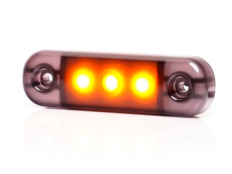 Lampa pozycyjna LED Was o wymiarach 84x24x10,4mm w stylowej, ciemnej obudowie z żółtym światłem. Zaprojektowana z myślą o profesjonalnych zastosowaniach, oferuje elastyczny montaż pionowy lub poziomy. Zasilanie 12/24V gwarantuje kompatybilność z większością pojazdów ciężarowych, dostawczych i przyczep. Klasa szczelności IP 6K9K zapewnia pełną ochronę przed kurzem oraz wysokociśnieniowym myciem na gorąco - idealna do wymagających warunków eksploatacji. Przewód o długości 240mm ułatwia instalację. Produkt posiada homologację ECE, co potwierdza zgodność z europejskimi normami bezpieczeństwa. Dzięki kompaktowym wymiarom lampa doskonale sprawdza się jako oświetlenie obrysowe w naczepach, przyczepach, busach, ciężarówkach oraz maszynach budowlanych. Ciemna stylistyka nadaje pojazdowi nowoczesny, dyskretny wygląd, a żółte światło zwiększa widoczność w trudnych warunkach atmosferycznych.